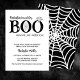 Tema do Chá de panela de Halloween "Ela achou seu Boo" com convite assustador, mas elegante, com anel de diamante, teia de aranha sobre um fundo preto escuro e brilhante com tipografia elegante e sofisticada. Esses produtos podem ser facilmente editados com seus detalhes pessoais.