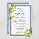 Uma vez que ela descobriu que o tema principal do limão-aperto-limão é o chá de panela de verão perfeito. A fruta de citrinos legal e refrescante cria sempre belas exibições e refrescos. A coleção de limões da Jenny pega limões de aquarela e os emparelha com azulejos azuis mediterrânicos. Neste design, os azulejos criam um quadro azul. Uma fina armação de ouro a eleva. Dois buquês de limão adicionam um toque floral. Ela achou que o "Main Squeeze" está escrito no topo. Seguem-se os restantes detalhes do brunch e da borbulha.