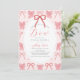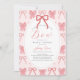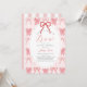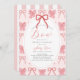 Este belo convite de chá "ela encontrou seu arco/beau" apresenta um fundo de rosa claro com um delicado padrão de arco/fita cor-de-rosa. O verso apresenta um fundo branco com faixas de rosa claro.