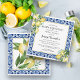 Quando ela descobriu que o tema principal do Chá de panela de limão apertado é o chá de panela de verão perfeito. A fruta de citrinos legal e refrescante cria sempre belas exibições e refrescos. A coleção de limões da Jenny pega limões de aquarela e os emparelha com azulejos azuis mediterrânicos. Neste design, os azulejos criam um quadro azul. Uma fina armação de ouro a eleva. Dois buquês de limão adicionam um toque floral. Ela achou que o "Main Squeeze" está escrito no topo. Seguem-se os restantes detalhes do chá de panela. Se precisar de ajuda para encontrar um item correspondente, por favor, envie-me uma mensagem. Sou Nelda e adoraria ajudar.