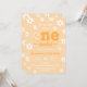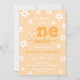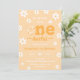 Um convite de aniversário de 1rua ano para uma garota bonita apresenta um texto de tipografia laranja e negrito "um maravilhoso" no meio e rodeado por flores de groovy retrô.
