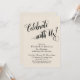 Este cartão de recepção de casamento único, mas simples, contrasta um texto elaborado com uma fonte cursiva e um fundo simples. Usando uma fonte elegante e fluida, eu representei graficamente as palavras "Celebre conosco!" na frente e, no verso, a palavra "amor". Seu próprio texto é facilmente adicionado para personalizar este modelo, tanto pouco quanto muito, conforme desejar. Use os campos do modelo para simplesmente inserir seus detalhes pessoais e clique para personalizar ainda mais, se desejar reposicionar qualquer uma das camadas desbloqueadas. Altere o fundo sólido para qualquer cor que preferir e adicione sua própria imagem no verso, se desejar. // 73 //