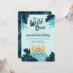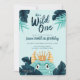 Ele é selvagem! Celebre a sua celebração de aniversário selvagem com o nosso convite de aniversário "Wild One" do monstro da selva tropical azul-aqua. O design apresenta as nossas folhas de palma da selva tropical desenhadas à mão e o fofo pequeno personagem de monstro azul selvagem vestindo uma coroa ouro e personalizado com idade de aniversário. Vai ser uma festa selvagem! Todas as ilustrações contidas no nosso convite de aniversário de um monstro azul selvagem são obras de arte originais feitas à mão pela Moodthology.