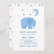 Bonito chá de fraldas Convite com elefante e lua engraçados, estrelas em cor azul pastel para o menino.