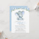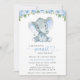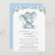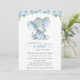 Celebre a chegada iminente do seu pacote de alegria com este convite para chá de fraldas na moda. Design apresenta flores azuis de cor aquosa (rosas e peões), folhas verdes e pequenos elefantes sobre fundo branco.