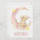 Elefante bonito sentado em uma lua crescente com estrelas douradas, flores e brilho para um convite para chá de menina.