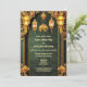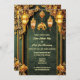 Um belo fundo floral brocade num verde-floresta escuro é coberto por bandas verticais ouros falsos e um arco florescente no topo. As elegantes lanternas índias brilhantes penduram ao longo da borda superior com um pequeno elefante ouro entre elas e duas flores de lótus aparecem ao longo da borda inferior. O fundo da brocade tem modelos brancos para sua redação personalizada. Os tons quentes dão a esta design uma sensação luxuosa, elegante e supermercado. O verso tem uma modelo adicional para mais detalhes para convidados e familiares. São ideais para celebrar Mehndi; Mehendi; Sangeet ou qualquer celebração ou casamento étnico-asiático.