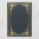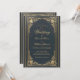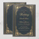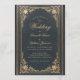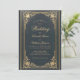 Este convite de casamento elegante com um ar vintage, recomendado para um casamento mais formal, "black tie", tem uma moldura dourada vintage com elegantes decorações barrocas em ouro sobre um fundo escuro semelhante ao couro azul. Os nomes da noiva e do noivo e a palavra Casamento são escritos em uma fonte caligráfica elegante. Todo o texto pode ser personalizado e tem uma cor dourada semelhante à moldura dourada vintage.