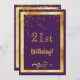 Um cartão de convite de festas festivo e elegante. Uma cor de fundo roxa escura e feminina e uma imagem falsa de ouro. Com o ouro confetti. Na frente do texto: aniversário de 21 anos! e decoração floral falsa de ouro. Traseira: Modelos para informações de sua festa, cartas de ouro.
