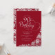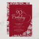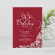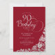 Convite simples e elegante de 90 anos em vermelho e preto com prata. Design sofisticado com rosas, folha prateada falsa e fonte de letra script. Cartão de convite moderno perfeito para uma celebração de aniversário feminina e elegante. Personalize com seus próprios detalhes. Pode ser personalizado para qualquer idade. Convites impressos da Zazzle ou modelo digital para impressão instantânea.