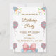 A charming birthday invitation featuring a soft neutral background with festive balloons, confetti accents, and a stylish gift illustration. Designed for a cheerful yet elegant celebration, this fully customizable template allows you to easily personalize the name, date, time, and location for your special event.