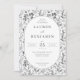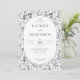 This elegant wedding invitation features a sophisticated monochromatic floral pattern with intricate botanical illustrations framing the central text. The design showcases a classic and timeless style, enhanced by clean lines and precise detailing in black against a crisp white background. The typography combines bold serif fonts for the names with lighter weights for additional details, creating a balanced and formal layout. Perfect for conveying sophistication and celebration, this invitation is ideal for couples seeking a refined and nature-inspired aesthetic for their special day.
