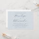 This elegant wedding invitation features a serene light blue background with a minimalistic layout that emphasizes sophistication and tranquility. The design showcases a refined script font for the names, creating a focal point amidst ample negative space, while the rest of the text is presented in a clean serif typeface. Perfect for an upscale event, this invitation conveys a mood of anticipation and celebration, ideal for couples seeking a classic yet modern aesthetic. Its customizable elements allow for personalization, making it suitable for any special occasion.