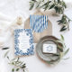 A timeless and elegant wedding invitation featuring a delicate vintage-style blue floral crest monogram and classic typography. The refined layout is paired with a coordinating blue vertical stripe pattern on the reverse, creating a sophisticated and cohesive design inspired by French countryside and coastal weddings.
