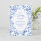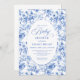 Create a timeless first impression with this baby shower invitation featuring elegant French toile de jouy roses in refined shades of navy blue, royal blue, dusty blue, and deep blue, inspired by classic chinoiserie floral design. This sophisticated style blends heritage elegance with modern charm, making it perfect for a memorable baby shower celebration.