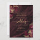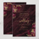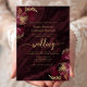 This elegant wedding invitation features burgundy red floral bouquets set off with gold faux foil greenery in two corners, on a background image of burgundy watercolor agate. The customizable text combines gold-colored serif, italic and handwriting fonts. The reverse side features a matching floral and agate design.