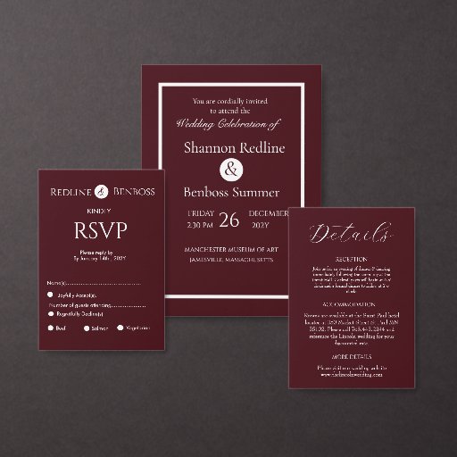 Set the tone for a sophisticated celebration with this elegant burgundy minimalist wedding invitation. Featuring a clean double-border frame, refined typography, and a rich wine-red backdrop, this design is perfect for couples seeking a timeless and luxurious aesthetic. Fully customizable—update names, dates, venue details, and fonts to match your wedding theme. Ideal for modern, classic, or formal weddings.