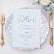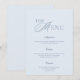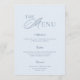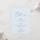 Elegant dusty blue wedding menu card featuring refined script typography and a minimalist design. Perfect for sophisticated wedding receptions, garden weddings, and classic celebrations. This timeless menu adds a stylish and coordinated touch to your wedding table setting.