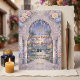 This refined wedding composition features a symmetrical garden arch framed with watercolor roses, hydrangeas, and cascading wisteria vines in soft lilac, blush pink, peach, dusty blue, and gentle greenery. A softly illuminated pathway and hanging lantern lights guide the eye toward the central arch beneath a deep twilight night sky, while Arabic Bismillah calligraphy appears above a structured typography layout combining decorative serif headings with flowing vintage script accents. Ornamental floral and geometric borders reflect classic Islamic and South Asian wedding stationery traditions commonly seen in Nikah ceremony designs.This is a flat printed image with a faux gold foil effect, not actual raised material.