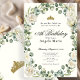 This elegant ivory and green floral 18th birthday debut invitation has peonies, a gold tiara crown, and an oval frame with a personalizable template to create your own message. The invitation template is customizable in the listing editor and is also available as a digital download that's printable after you personalize it. The back has a gold crown in the same floral frame as the text on the front.