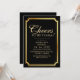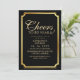 Modern stylish birthday party invitation black with gold dust on with a gold ink pour effect (the gold is a digital effect, not real foil) and modern calligraphy. Classy and elegant, simple and modern invitation.