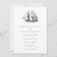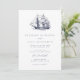 This elegant wedding invitation features a vintage illustration of a sailing ship, which you can replace with an image of the boat where you will be married (transparent or white background preferred). Elegant dark blue lettering in serif and script fonts lay out the bride and groom names, and details of the wedding, including the location, date, time, and reception.