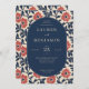 This elegant wedding invitation features a central oval frame surrounded by a vibrant floral border in shades of deep navy blue and coral red, creating a striking contrast against the white background. The design showcases stylized flowers and leaves arranged in a grid-like pattern, adding a decorative touch without overwhelming the text. With a vintage feel emphasized by serif typography, the layout is symmetrical and classic, conveying a formal and celebratory mood perfect for a sophisticated event. Customizable elements allow personalization for names, dates, and addresses, making it ideal for marking this special life moment.