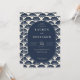 This elegant wedding invitation features a sophisticated navy blue background adorned with stylized seashell motifs, creating a luxurious and textured feel. The central oval frame showcases customizable text in a classic serif font, emphasizing formality and tradition. Perfect for a formal celebration, the design conveys an atmosphere of elegance and anticipation, making it ideal for couples seeking a timeless and refined look for their special day.