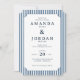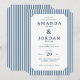 This elegant wedding invitation features a classic vertical layout with alternating blue and white stripes framing the central text, creating a timeless and sophisticated look. The design utilizes clean serif typography to convey essential details in a formal yet inviting manner, perfect for traditional celebrations. Decorative corner flourishes add subtle charm without overwhelming the refined aesthetic, while ample negative space ensures clarity and focus on the event's key information. Ideal for couples seeking a vintage-inspired touch, this invitation sets the tone for a joyous and memorable occasion.