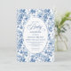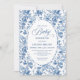 Create a timeless first impression with this baby shower invitation featuring elegant French toile de jouy roses in refined shades of navy blue, royal blue, dusty blue, and deep blue, inspired by classic chinoiserie floral design. This sophisticated style blends heritage elegance with modern charm, making it perfect for a memorable baby shower celebration.