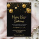 Elegant New Year invitation card featuring gold ornaments hanging against a black background. Details reveal event on December 31 at 7 PM.