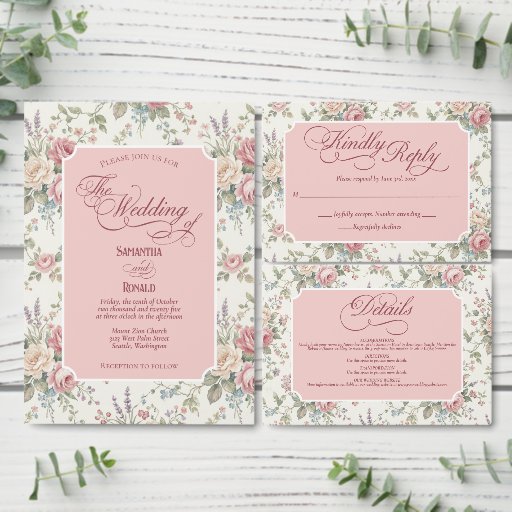 A wedding invitation featuring pastel rose bouquets and a shabby chic design.