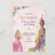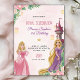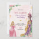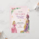 Pink birthday A pink birthday invitation for "Princess Sophia's 3rd Birthday" featuring two princess illustrations, one in pink and one in purple, surrounded by flowers and a castle. The text includes event details and RSVP information, set on a marble background. The tone is whimsical and festive.