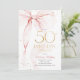 Elegant pink bow 50th birthday invitation. Feminine design in blush pink and gold. Features trendy watercolor coquette bow, and modern typography font. Perfect for an elegant style women's bday celebration. Personalize with your own details. Printed Zazzle invitations or instant download digital printable template.