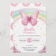 Front and back of a birthday invitation card featuring a pink butterfly, rainbow, and floral accents. Bright and whimsical design with celebration details.