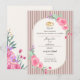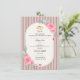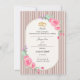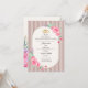 A beautiful and elegant wedding invitation featuring soft pink and purple floral designs with delicate gold wedding rings. The invitation is framed with a classic striped background and a graceful arch, creating a romantic and sophisticated look.