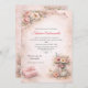 This pastel-toned illustration offers a charming and romantic backdrop for a birthday party invitation. Delicate floral arrangements—roses, peonies, daisies—adorn the corners, each tied with a pink gingham ribbon, while a soft yellow butterfly and a pink gift box add playful touches. A pair of gold rings near the jar hint at celebration and connection, though the overall mood remains light and festive. With its gentle textures and central blank space, the design invites joyful personalization, perfect for honoring someone special with elegance and warmth. The back of the card is a variation of the graphic on the front Personalize with your own information.