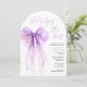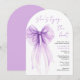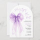 Elegant arch-shaped bridal shower invitation featuring a purple coquette bow watercolor, "she's tying the knot" showcased in a chic purple calligraphy script, and the bride's name and shower details in simple lettering.