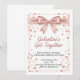 "Celebrate friendship in style with this chic 'Galentine's Get-Together' invitation design. The card features a stunning, realistic pink satin bow at the top, cascading into a shower of rose gold glitter and soft pink hearts. Set against a clean white background, the typography blends elegant script with modern serif fonts to create a warm and inviting atmosphere. Perfect for a girls' night out, brunch, or an evening of bubbles and sweet treats on February 13th. This design captures the essence of feminine elegance and festive fun