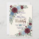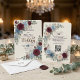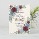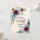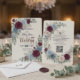 Streamline guest replies with this tech-savvy autumn stationery, featuring rich burgundy and muted blue florals over a faux textured cream background.This formal stationery piece utilizes a printed light cream textured paper effect to ground a balanced composition of deep maroon and dusty blue botanical illustrations. The layout's visual hierarchy highlights a classic serif monogram featuring the initials E and W, framed by printed dimensional layered blossoms, peach buds, small blue filler flowers, and eucalyptus greenery. Deep maroon text and dark navy details in calligraphic script provide crisp, accessible contrast alongside a functional black scannable square.This is a flat printed image with a printed dimensional layered floral and textured paper effect, not actual raised material.