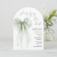 Elegant arch-shaped bridal shower invitation featuring a sage green coquette bow watercolor, "She's tying the knot" showcased in a chic calligraphy script, and the bride's name and shower details in simple lettering.