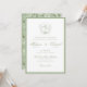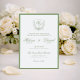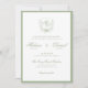 The front features a classic white layout framed by a soft sage border, adorned with a delicate botanical crest and monogram wreath, perfect for showcasing your wedding details in a clean, sophisticated style. The typography blends graceful script with refined serif fonts for a formal yet airy look. The back of the invitation is finished with a soft sage leafy pattern, adding depth, texture, and a coordinated botanical touch that feels both natural and luxurious.