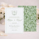 The front features a classic white layout framed by a soft sage border, adorned with a delicate botanical crest and monogram wreath, perfect for showcasing your wedding details in a clean, sophisticated style. The typography blends graceful script with refined serif fonts for a formal yet airy look. The back of the invitation is finished with a soft sage leafy pattern, adding depth, texture, and a coordinated botanical touch that feels both natural and luxurious.