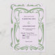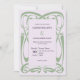 A harmony of grace and refinement, this elegant wedding invitation captures the timeless allure of Art Nouveau design. A motif of flowing, sage green ribons curl and intertwine across a soft lilac background. The composition is then finished off with complimentary deep purple typography. The graceful symmetry of the design evokes a unique mixture of vintage opulence and modern chic. Perfect for fans of vintage design or those who are looking for an invitation that feels equally classic and contemporary.