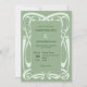 A harmony of grace and refinement, this elegant wedding invitation captures the timeless allure of vintage art nouveau design. A motif of flowing, mint green ribbons curl and intertwine across a sage green background. The composition is then finished off with complimentary deep green typography. The graceful symmetry of the design evokes a unique mixture of vintage opulence and modern chic. Perfect for fans of vintage design or those who are looking for an invitation that feels equally classic and contemporary.