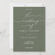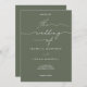 The calming sage green background, a color symbolizing harmony, growth, and renewal, provides the perfect canvas for the crisp white text. The elegant handwritten-style script for 'the wedding of' adds a touch of artistic grace and personal warmth, while the clear sans-serif font for your important details ensures readability and a contemporary feel.
