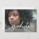 These elegant 2026 graduation announcements feature modern white script classic typography on the front as an overlay on your photo. The back has a dark, black background with simple white text and another photo, along with a scannable QR code to link to graduation ceremony details, or more photos of the graduate.