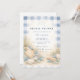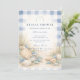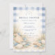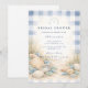 A refined coastal bridal shower design featuring an elegant oval wreath of seashells, oyster shells, starfish, and soft sea glass accents. Neutral sandy tones blend with muted ocean blues and delicate dune grasses to create a serene seaside aesthetic. The airy parchment background enhances the natural textures while maintaining a graceful, elevated look. Perfect for a beach-inspired celebration with timeless coastal charm.