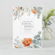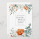Invite your guests with the warm, sophisticated charm of this elegant wedding invitation. The design features stunning, painterly watercolor floral arrangements blooming across the top and bottom against a clean white background. Vibrant terracotta orange poppies or peonies provide a beautiful focal point, complemented by soft peach blossoms and delicate creamy white filler flowers. This exquisite bouquet is artfully interwoven with sprays of dusty blue-green eucalyptus leaves, creating a fresh, modern, and romantic feel with a touch of rustic elegance. A minimalist, thin pale teal-green square frame provides a clean, contemporary border for your event details. Ideal for autumn or spring weddings, this invitation design is also perfect for elegant bridal showers, garden parties, milestone birthdays, or anniversary celebrations. This versatile design can also be adapted for sophisticated corporate events, seasonal promotions, or elegant announcements requiring a modern, botanical touch.