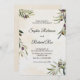 "Elegant wedding invitation with floral olive branch accents in corners. Text in black script on a creamy background invites guests to a celebration."